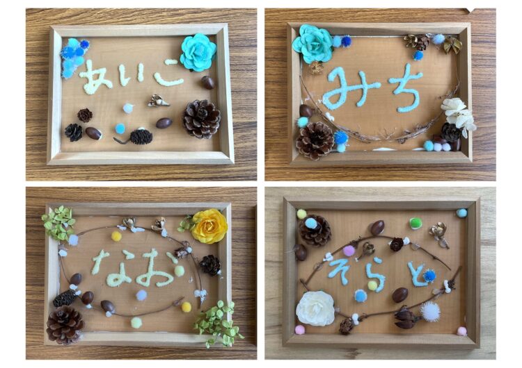 『ネームボード』では、ボンドで書いた名前に砂をつけて、額縁に木の実やお花を飾りつけ。