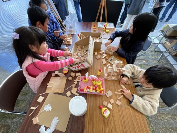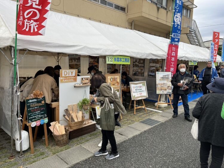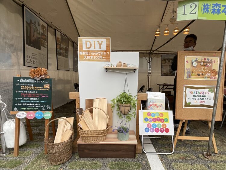 森本工務店ブースでは、来年のカレンダーを配ったり、『ネームボード』と『つみき木工』のワークショップや無垢の木の端材を準備してお迎えしました。