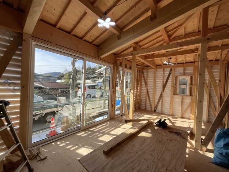 外の駐車場の水たまりに氷が張るくらい厳しい寒い中、大工さんが造作工事をしています。