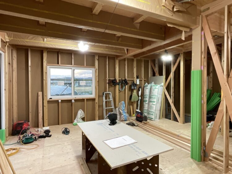 この日はお客様にも来ていただいて、現場を見ながらコンセントの高さや、室内の壁に明り取りのスリットを開ける位置を確認しました。