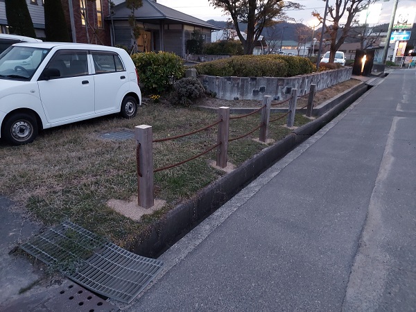 本社と道路との境のロープ塀の杭が痛んだので、土木班が新しいものに交換してくれました。