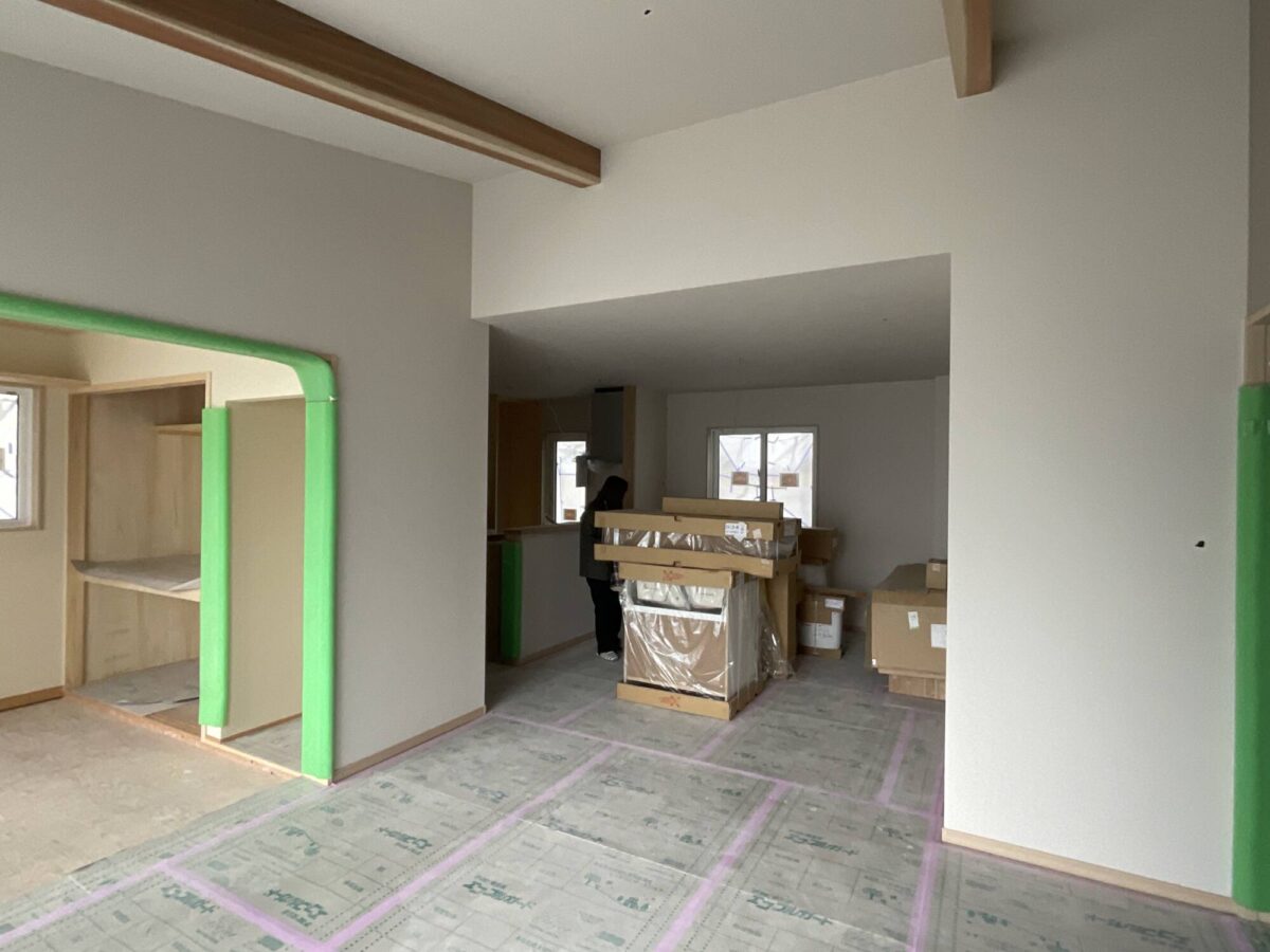 1件目は、クロスが貼り終わっていて、これから取り付けるトイレや洗面化粧台などの水まわりや、スイッチ・コンセントなどの器具が運び込まれていました。