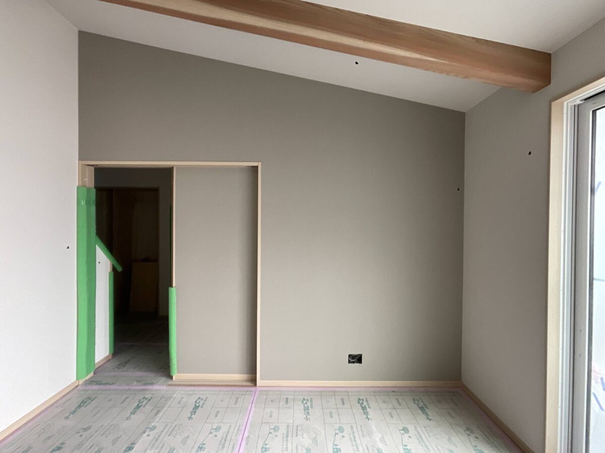 奥様と一緒に考えながら選んだアクセントのクロスが良い感じになっていることを確認してもう一つの現場へ。