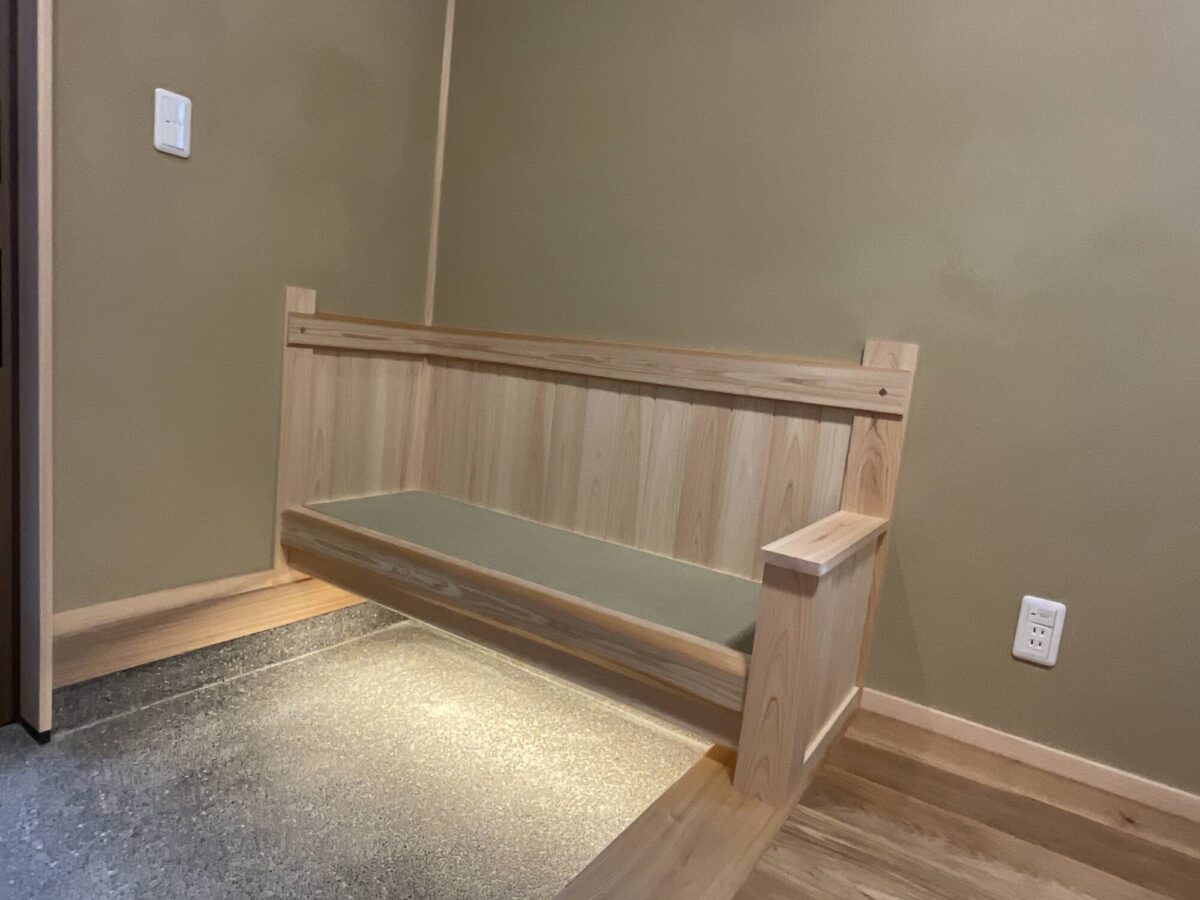 玄関ドアを開けるとベンチがあります。監督さんのアイデアで座面は畳を使っています。