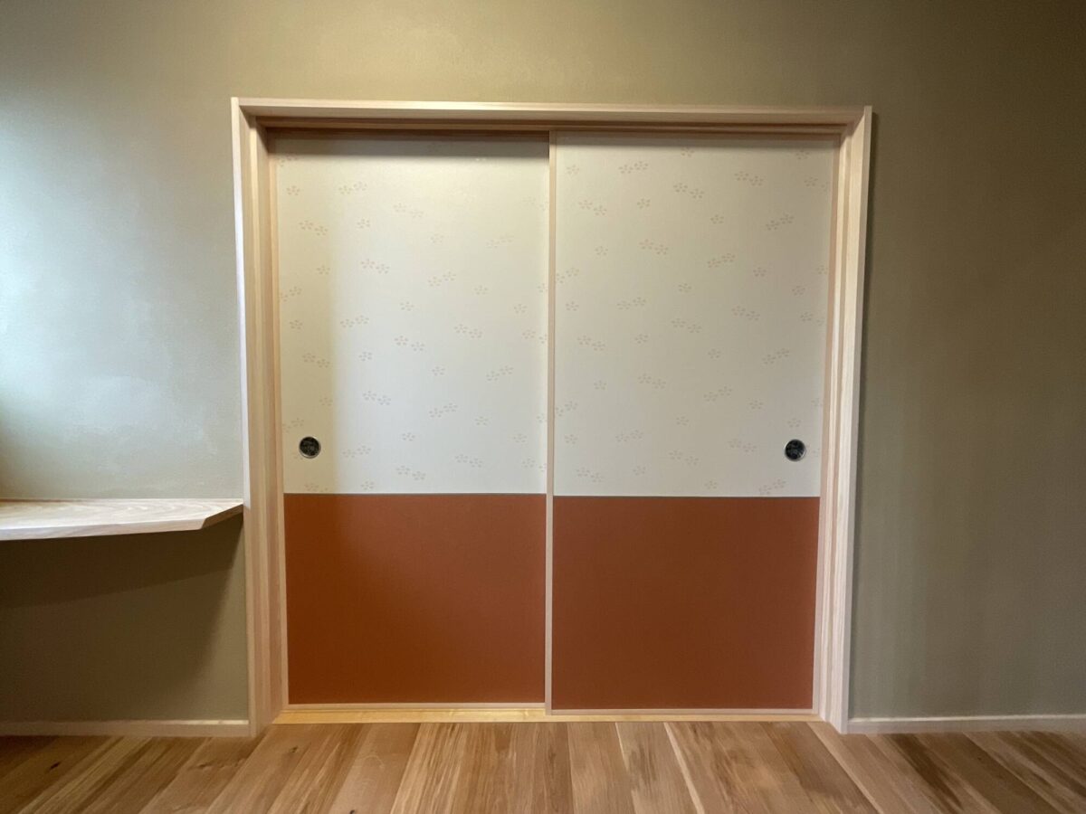 正面には和室へつながる襖が見えます。よく見ると小さな桜の花びらをあしらった柄と朱色のコンビネーション。