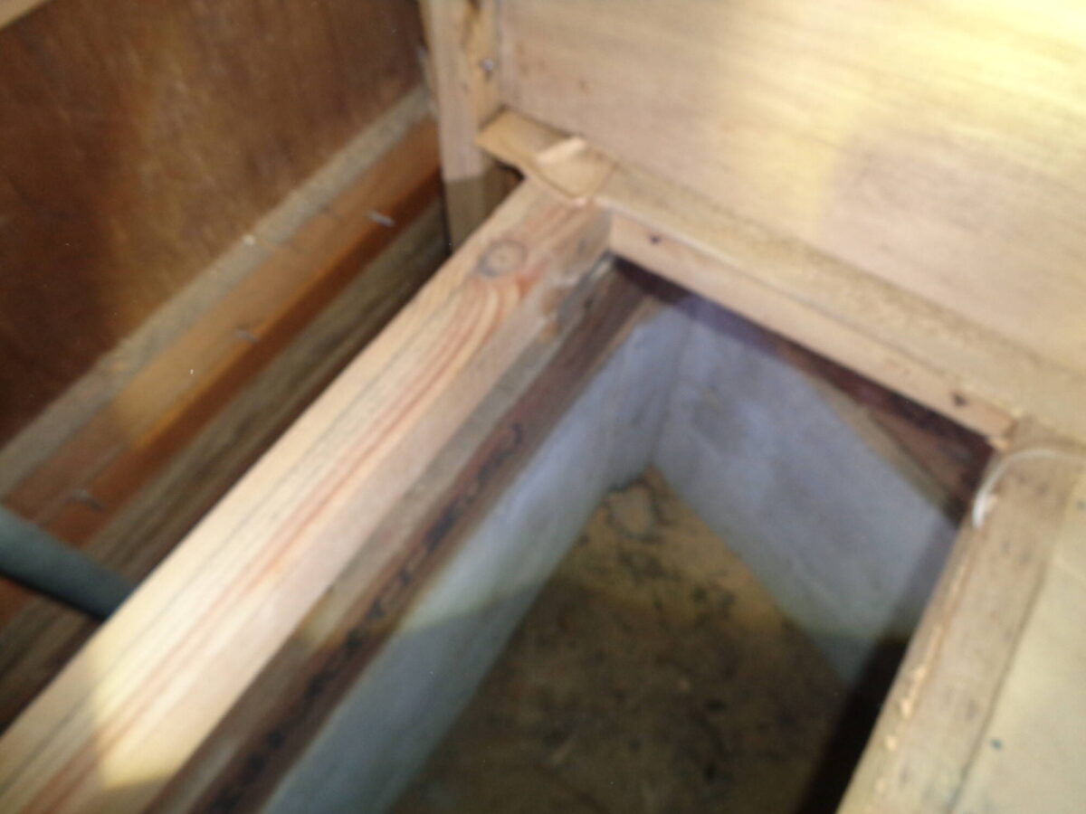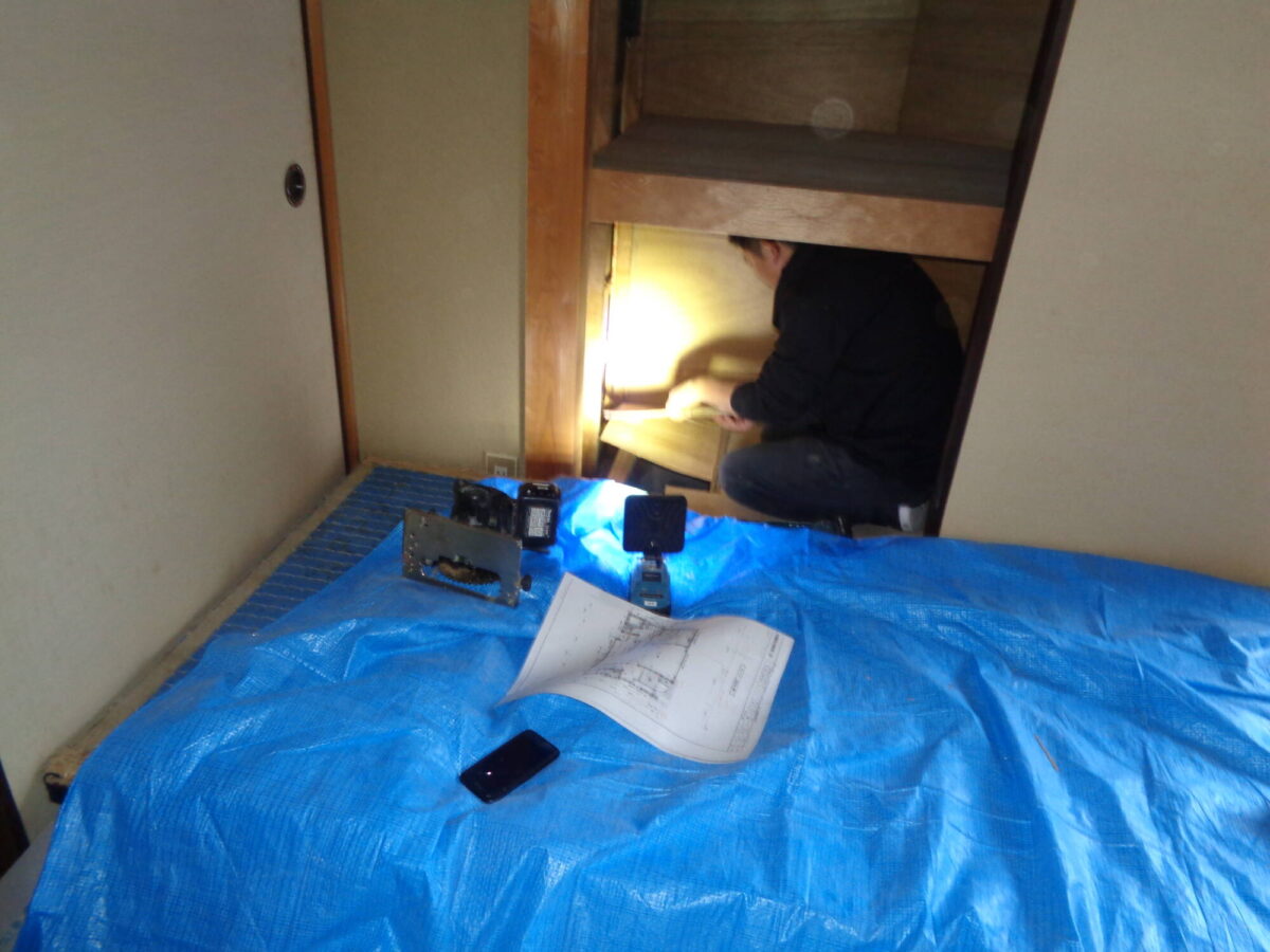 現場では大工さんが床下を一部開口し、そこに潜って邪魔になる部材を切断し(写真では根太掛けを切断)、