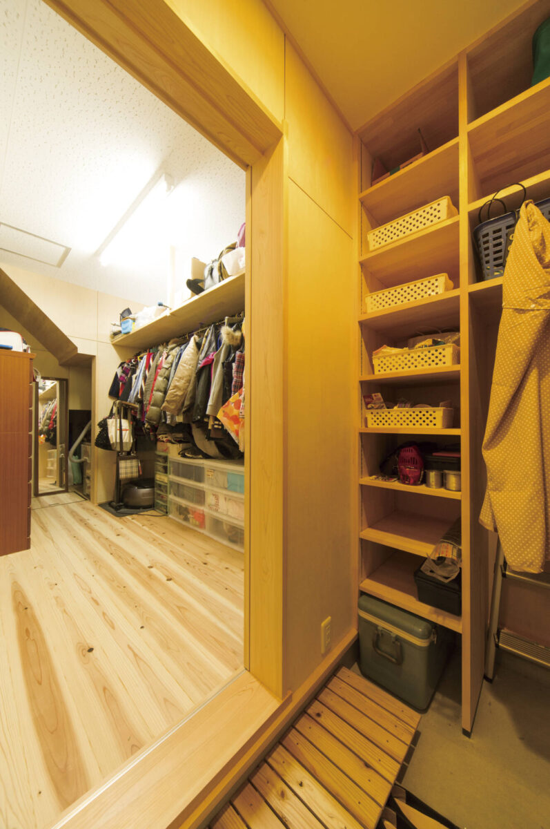 シーズン用品の収納は、オフシーズンには天井に近い上部に。