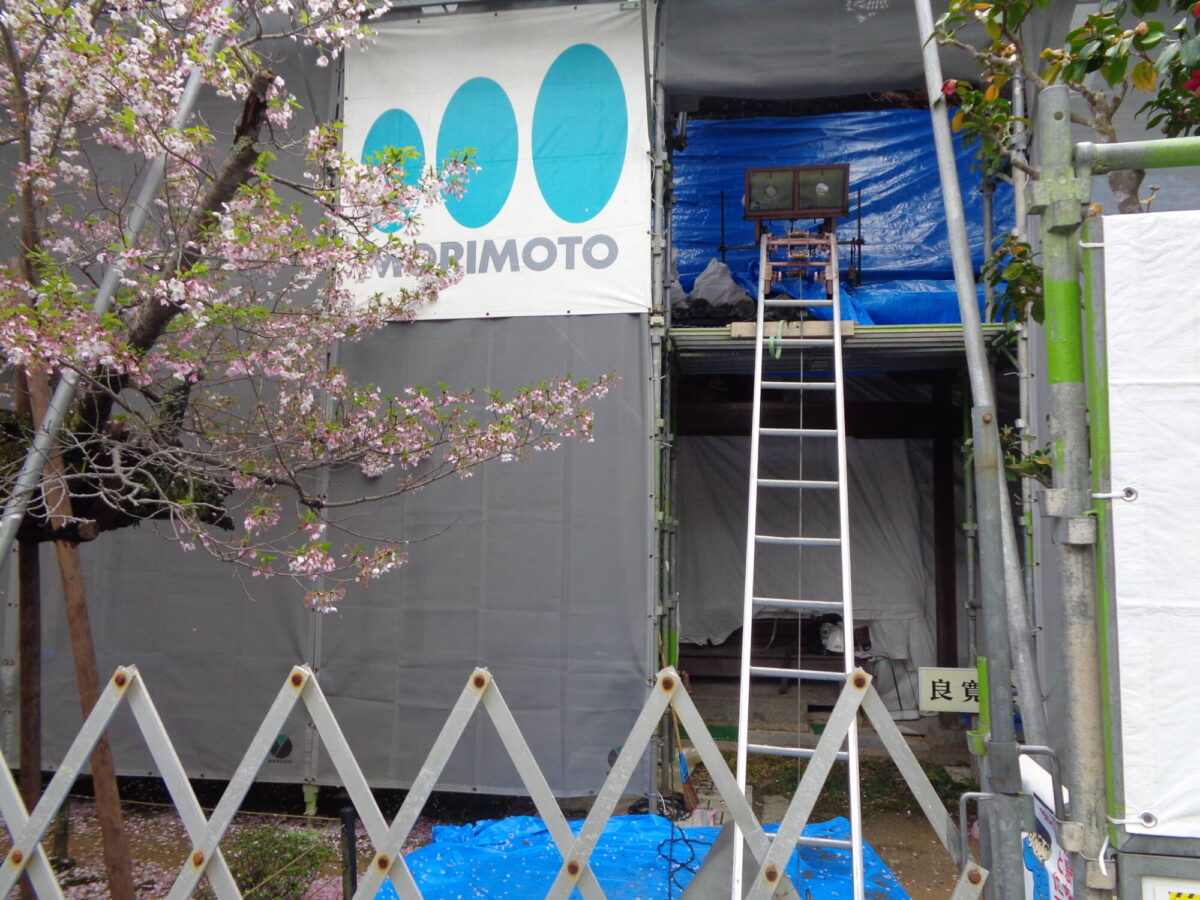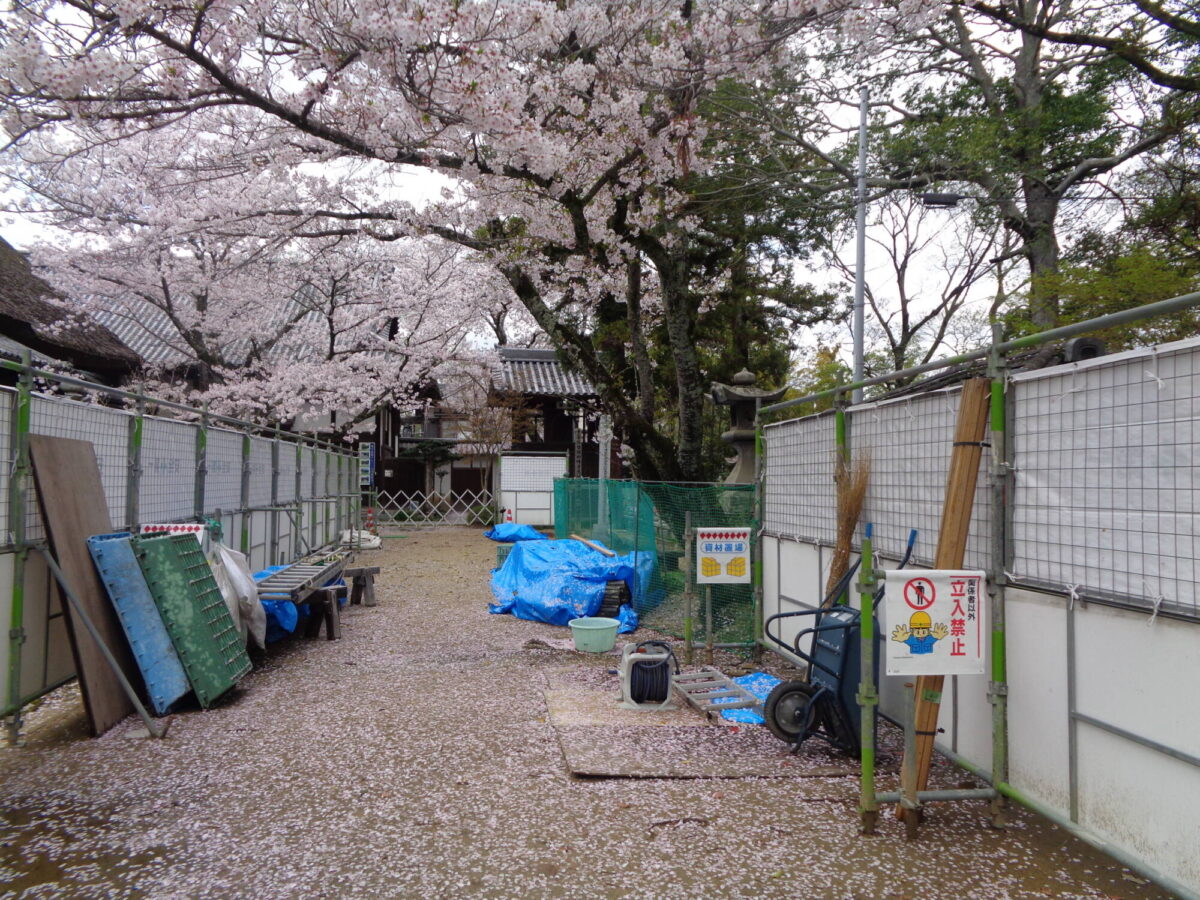 瓦の仮置き場は一面ピンクの桜のジュータンになっていました。