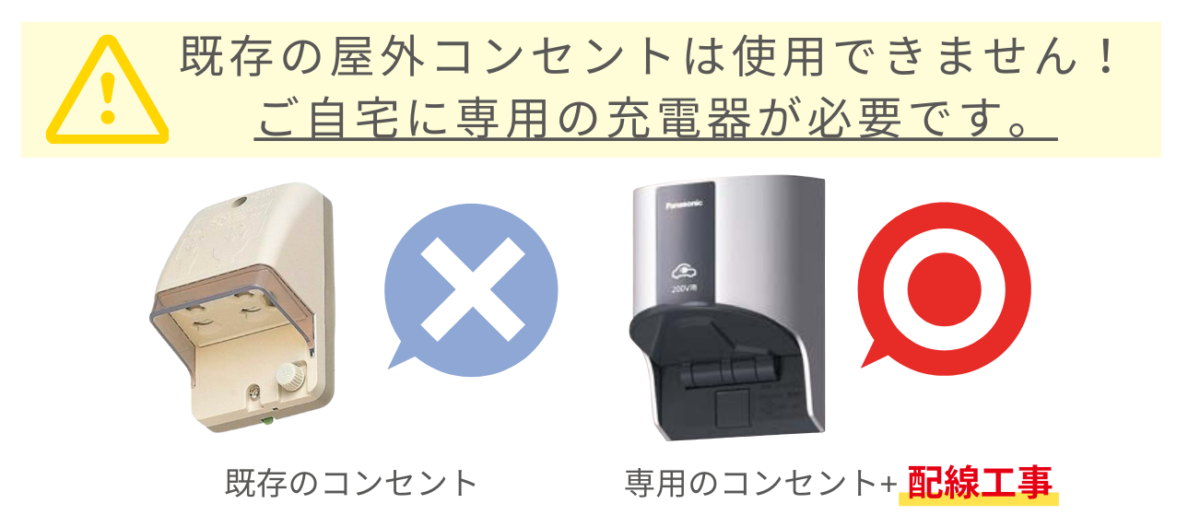 専用のコンセントに取替えて、配線工事を行えば電気自動車を充電することができます。