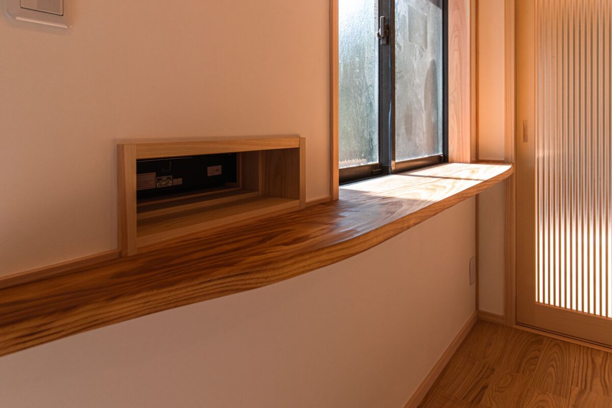 さらに、新聞・郵便物が室内で受け取れるように受け口と、天然木の一枚板でカウンターを取り付けました。