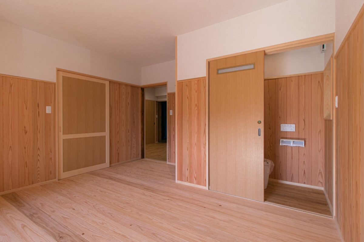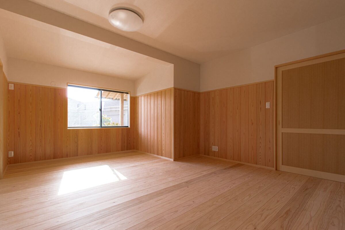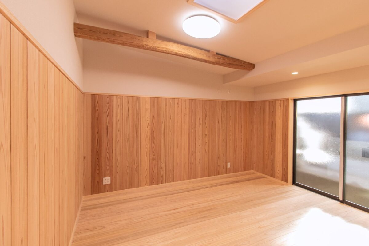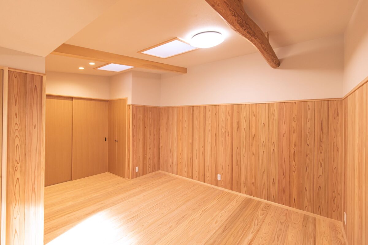 床・腰壁を調湿能力の高い厚い杉板貼にして吸音効果も期待。