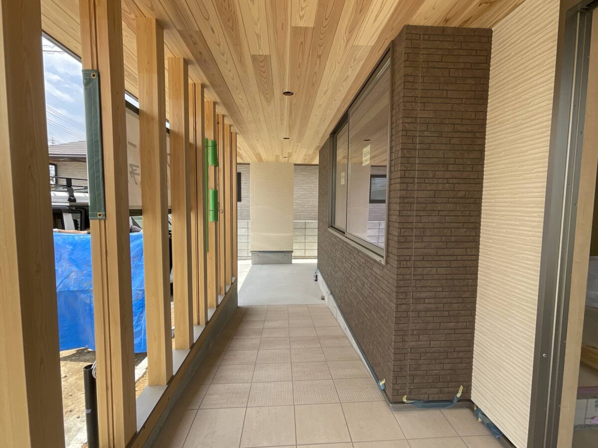 建物正面には桧の柱をそのまま見せたりアプローチの天井にはスギ板を貼って温かい雰囲気に。