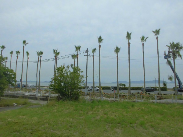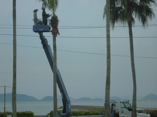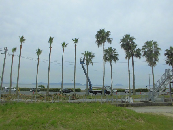 ウォ~ンウォ~ンウォ~ンと大きな音がするので、何の音だ???と思い、音を辿っていくと沙美海岸の駐車場にある大きな木!の剪定中でした!!