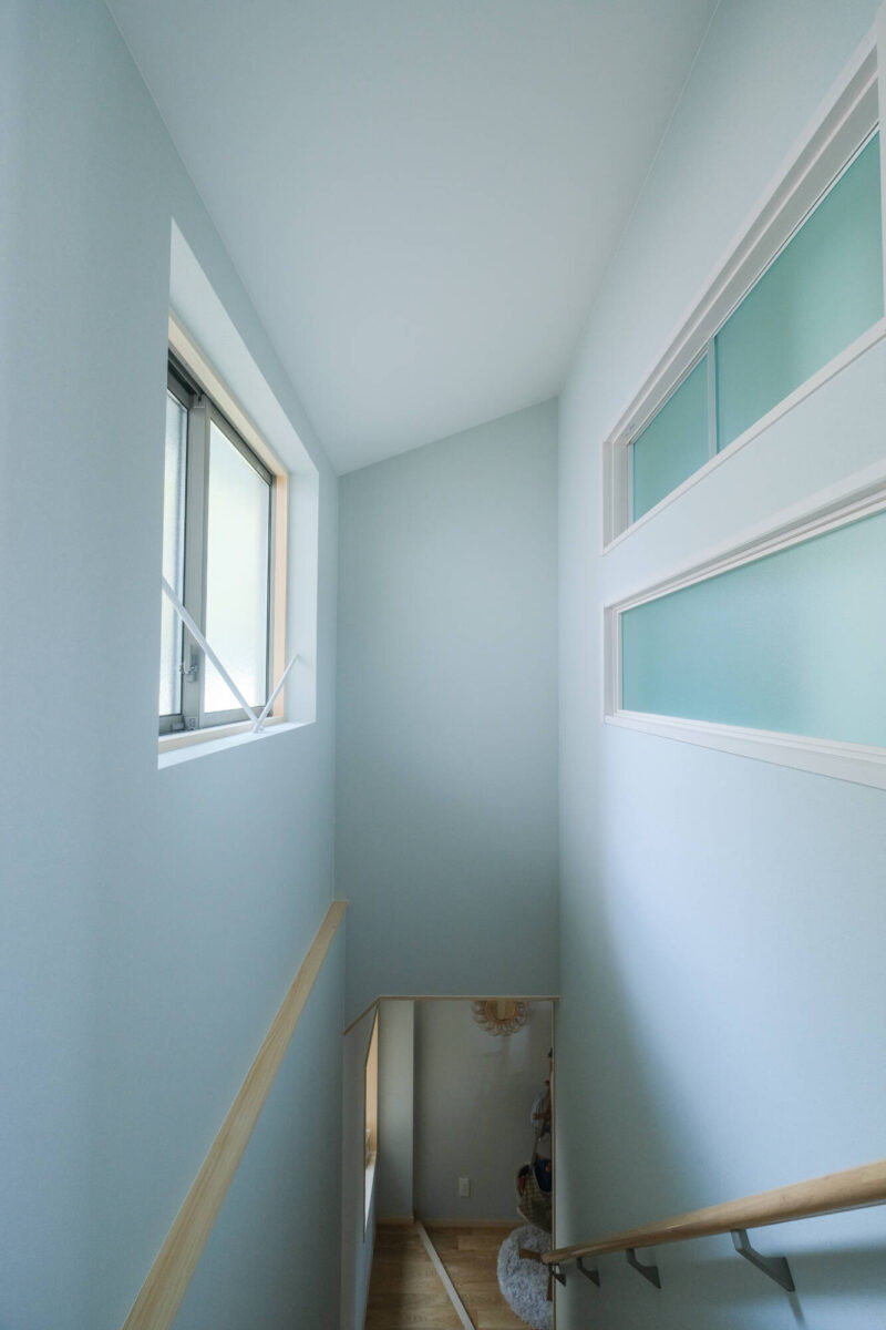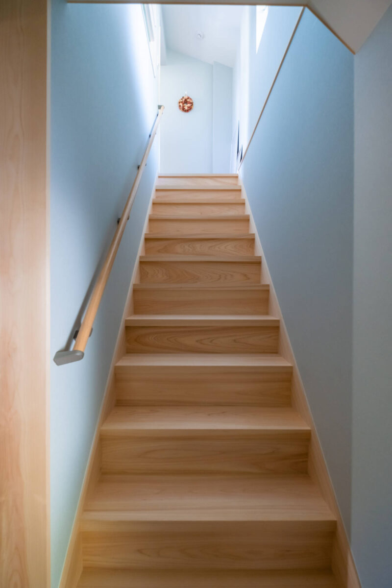 玄関ホールからの階段は、急勾配にならない様に、ホール部に2段の廻り部をとり、