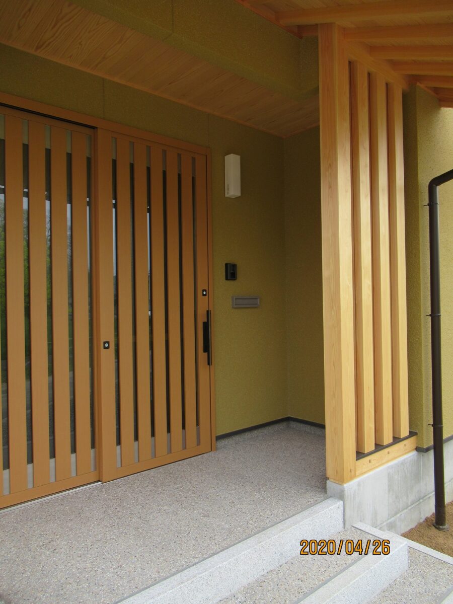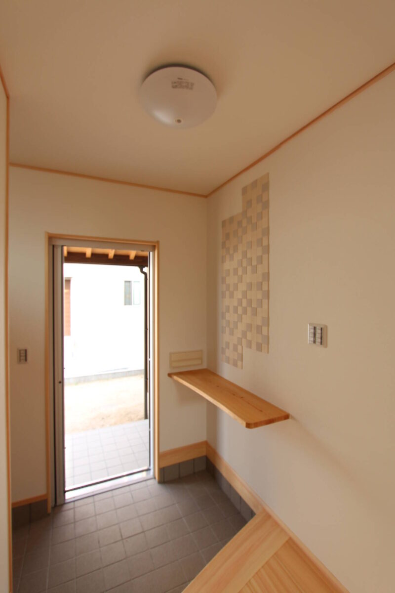 玄関建具の横に照明・ドアホンと共に。屋内は天然木の一枚板の棚を取り付けました。玄関ホールなので雨も風も大丈夫です。
