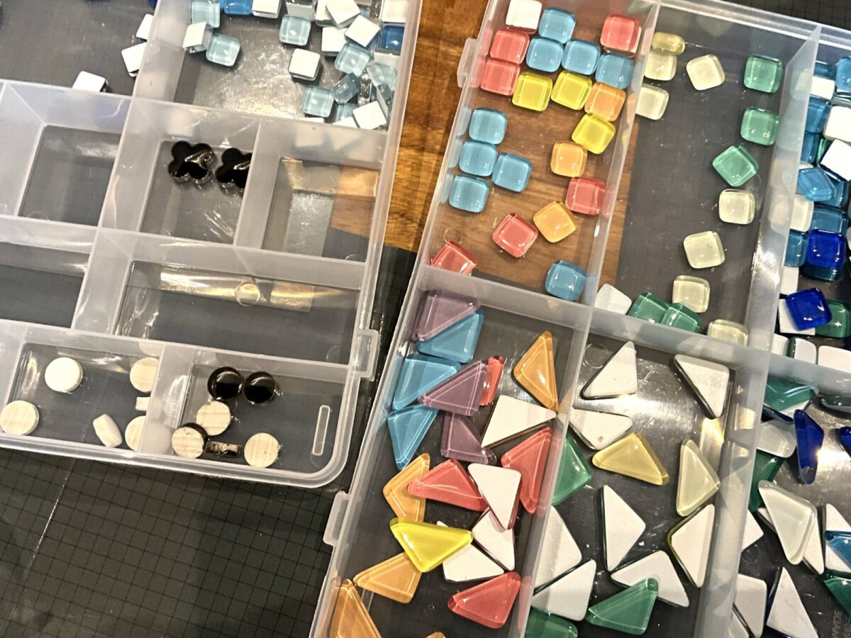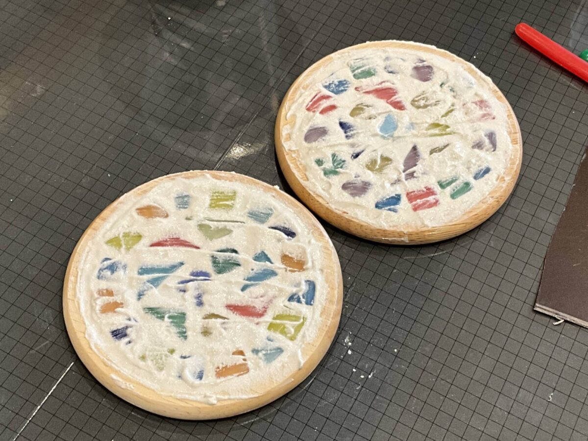タイルの配置が決まったら、枠にタイルをボンドで貼付けて、目地材で埋めていきます。