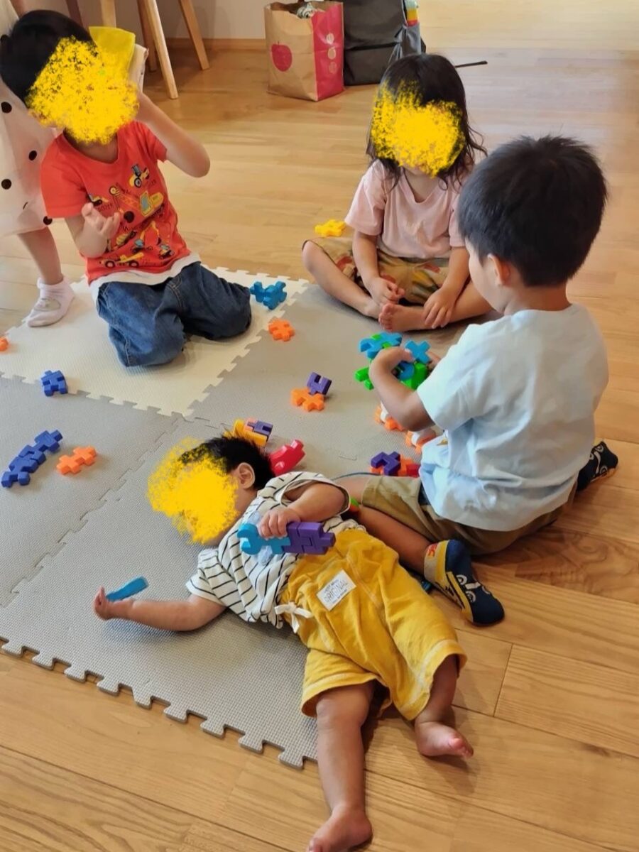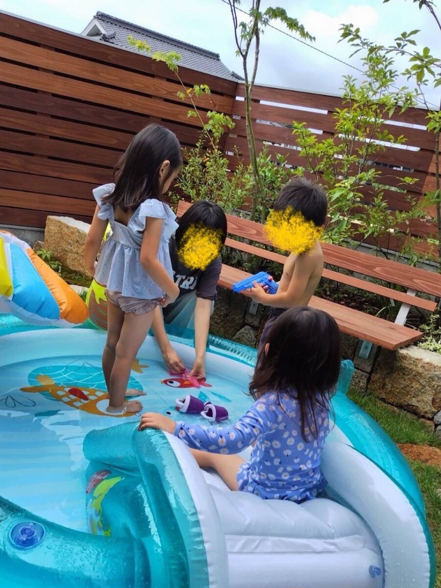 お庭でプールを広げて水遊びをしたり、建物の中でお子様同士で遊んだり、お昼にはそれぞれのご家族がおかず1品を持ち寄りみなさんでシェア♪遊びも見守りもみんなでシェア♪