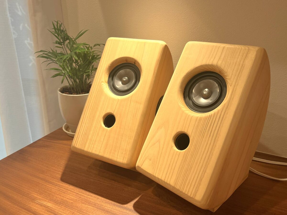 モデルハウスに設置しているスピーカーですが、実はヒノキでできているんです!