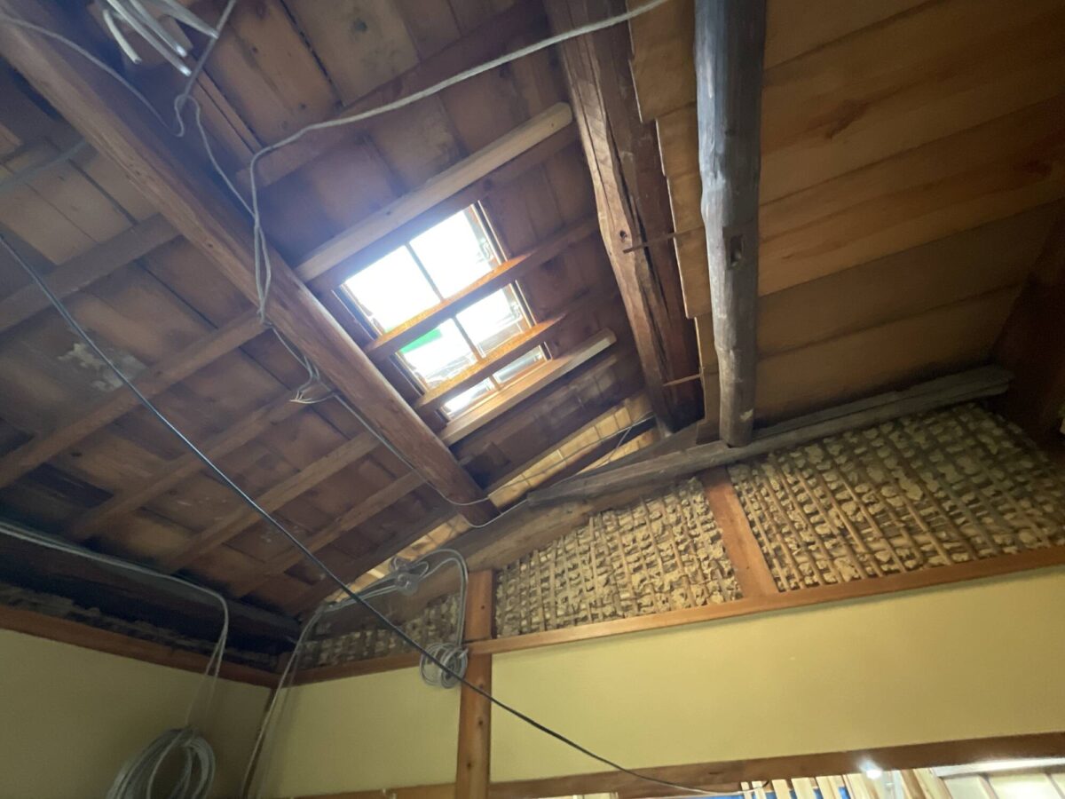 低かった天井は取っ払って屋根の勾配に沿って斜めの天井に。