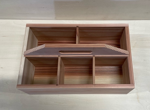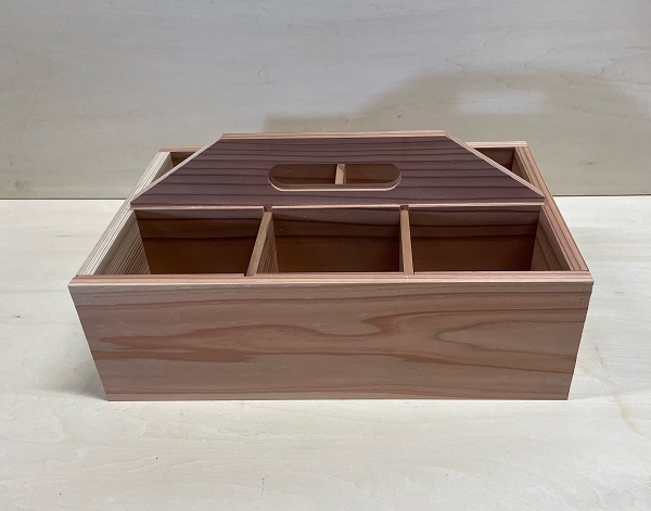 持ち手付きの小物入れで材料に杉を使っているので軽いです。