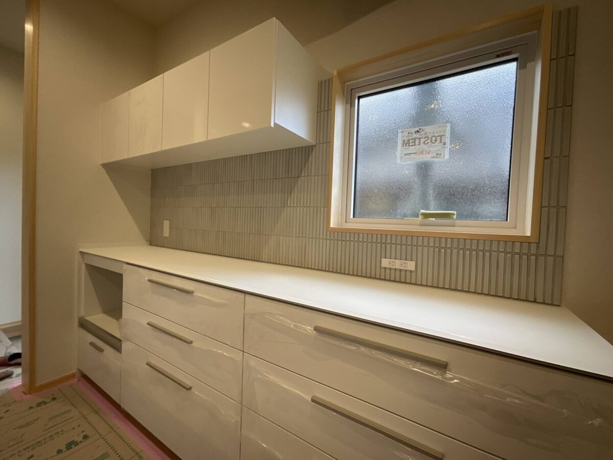 お客様がこだわられたタイルや照明も取り付けられて完成まであと少し。