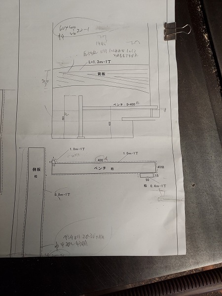 現場監督より加工図をもらって、ベンチの部材を造ります。