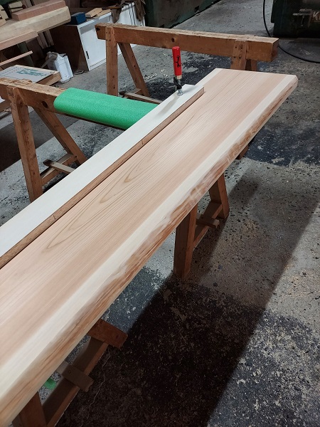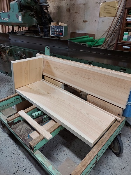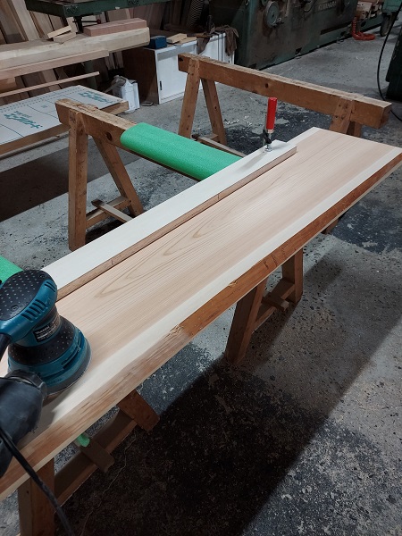 背持たれ用の板は、皮付きなので前回の敷台と同じように、サンダーで仕上げています。