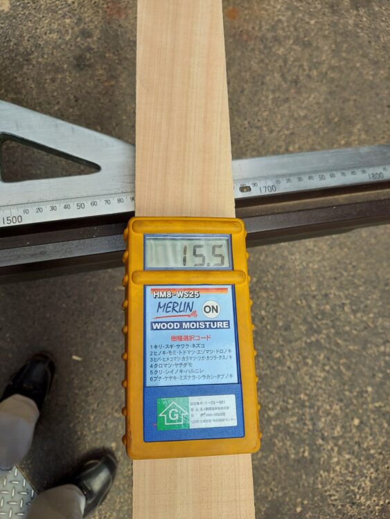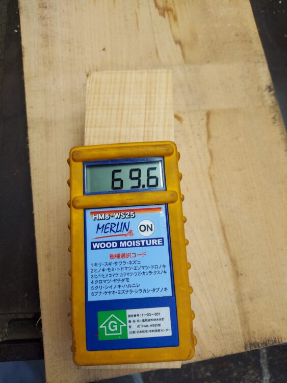 桧の木材を計ると、15%ほどでした。ちなみに、水に付けて水分を吸わせると、70%近くになりました。