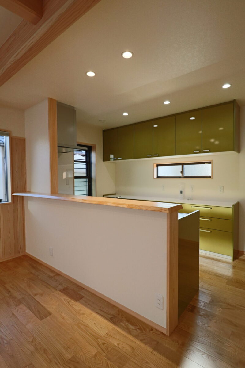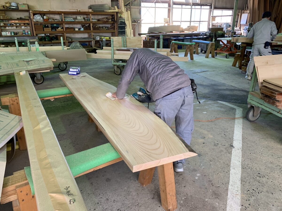 桧の天然木一枚板のキッチンカウンターの工場加工。取り付け完了。