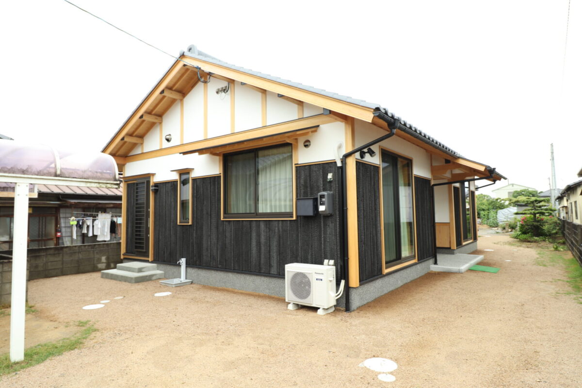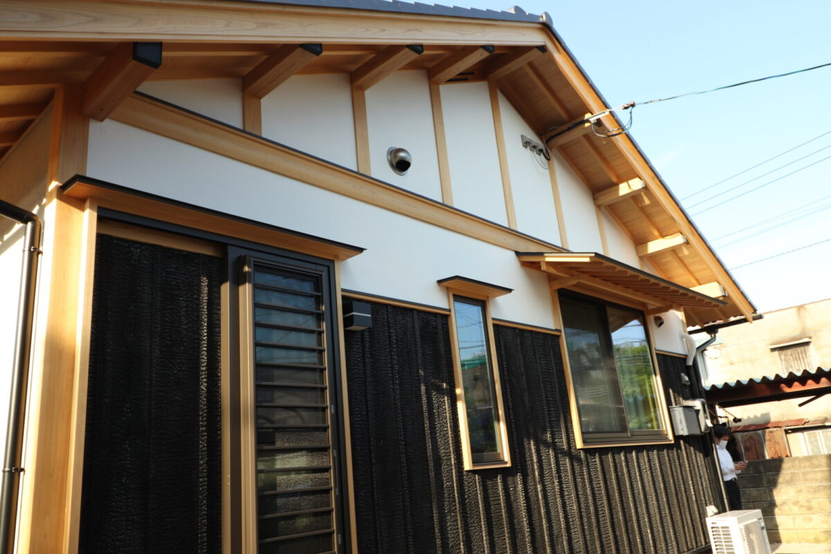 屋外仕上げは、本焼き板貼り・漆喰塗・化粧腕庇・板庇・化粧梁・化粧束と、
