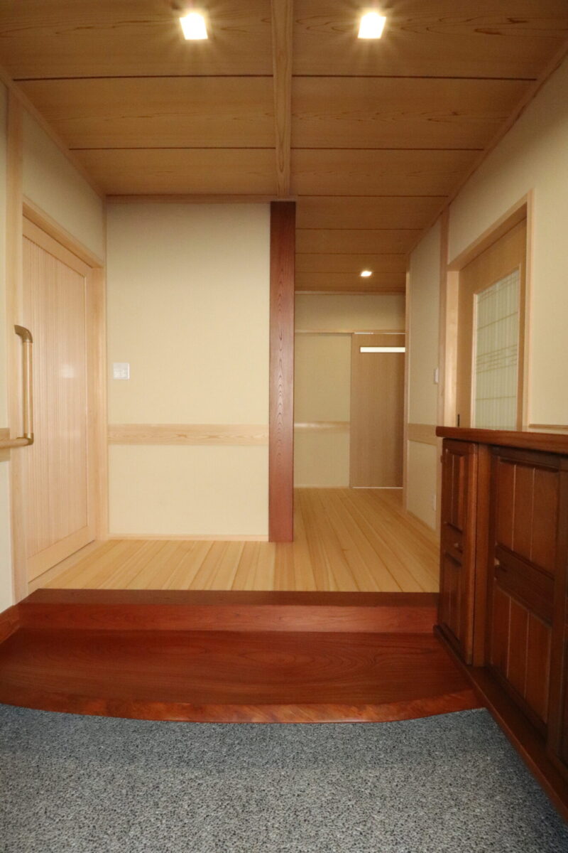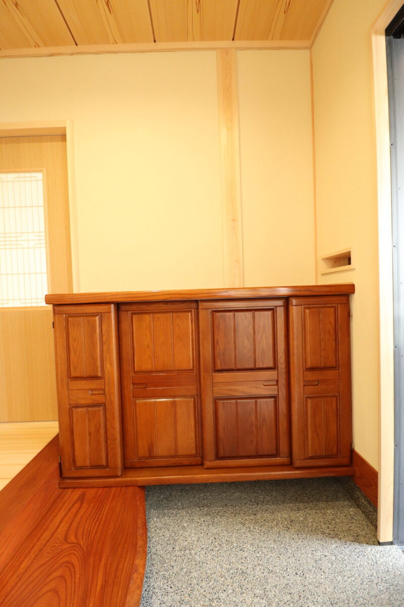 お手持ちだった下駄箱を造り付けにして、大黒柱共、同色仕上げに。