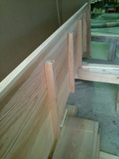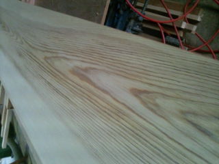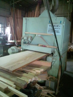 2015.10.31 松の前板 スタッフブログ #木について 最近は、あまりなくなってしまいました和室に床の間。 この板は、床の間の前板の松です。幅が広いので、仕上げにワイドサンダーという機械で仕上げています。 中で、ペーパー(紙やすり)がロール状になっていて、これが高速回転しながら仕上げてゆきます。 写真5は、板の裏に桟木(さんぎ)をつけているものです。 幅が広い板ほど、空気中の湿気を片側だけ多く吸うと反りやすくなる為、このように桟木で、反りにくくしています。 資材課の三宅でした。