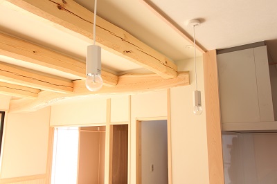写真はLDKの一部です。天井の梁をどの角度から写したらかっこよく撮れるか迷いました。