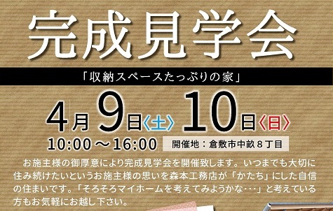 2016.04.06 完成見学会開催 スタッフブログ #イベント 完成見学会のお知らせです。 今週末、4/9(土)4/10(日)倉敷市中畝8丁目にて開催します!収納スペースをたっぷり確保した、木の香る住まいです。靴が100足以上入る「土間収納」や落ち着いて家事やデスク作業ができる「家事室」など間取りにこだわりました。 木造住宅ってどんな家?計画はまだだけど家にかかる費用を知っておきたい。など、マイホーム計画はこれから!っていう方もお気軽にお越し下さい☆ 詳しくはこちらをご覧下さい★ デザイン室 那須