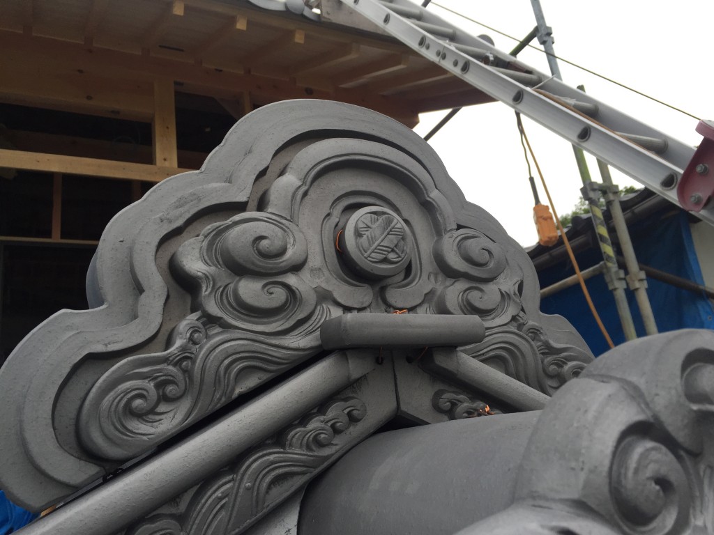 2016.05.28 家紋 スタッフブログ #現場 鬼瓦に家紋を入れました。写真のようにお客様から座布団や着物など家紋の入ったものを見せて頂き、瓦屋さんに特注で制作してもらいます。写真のように鬼瓦の中央部に入りました。なんだか鬼瓦が胸を張って立っている気がします。かっこいいですね(^^)建築部 梶谷